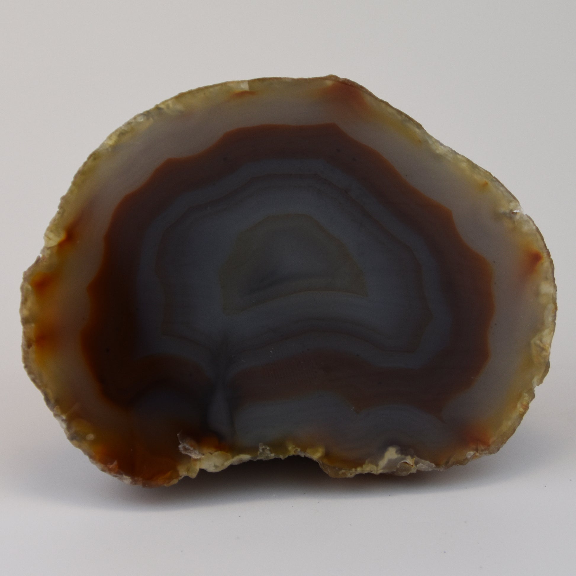 This beautiful Agate Geode is the perfect addition to any home. It features a solid agate geode, natural back, and polished face with brown banding throughout. It is sure to be a conversation starter and bring a touch of nature to any interior!